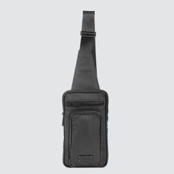 ![Back view of a utilitarian style sling in grey upcycled nylon material on a white background.]()